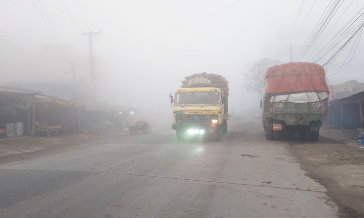 কুয়াশার চাদরে ঢেকে গেছে গ্রামীণ জনপদ। কিছুই দেখা যাচ্ছে না। সোমবার দুপুরে ১২ টার চিত্র। ছবিটি বগুড়ার ধুনট উপজেলার গোসাইবাড়ি এলাকা থেকে তোলা।