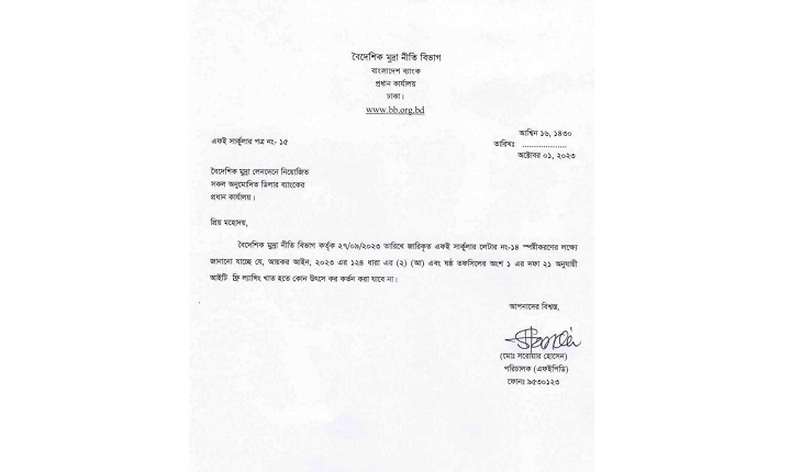 এতে বলা হয়, বৈদেশিক মুদ্রা নীতি বিভাগ কর্তৃক ২৭/০৯/২০২৩ তারিখে জারিকৃত একই সার্কুলার লেটার নং-১৪ স্পষ্টীকরণের লক্ষ্যে জানানো যাচ্ছে যে, আয়কর আইন, ২০২৩ এর ১২৪ ধারা এর (২) (আ) এবং ষষ্ঠ তফসিলের অংশ ১ এর দফা ২১ অনুযায়ী আইটি ফ্রিল্যান্সিং খাত হতে কোন উৎসে কর কর্তন করা যাবে না।