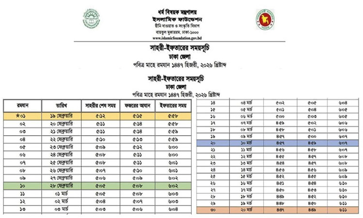 মঙ্গলবার (২০ জানুয়ারি) ইসলামিক ফাউন্ডেশন ১৪৪৭ হিজরির রমজান মাসের সেহরি ও ইফতারের এই সময়সূচি প্রকাশ করে। বায়তুল মোকাররম জাতীয় মসজিদের খতিবের নেতৃত্বে দেশের শীর্ষ মুফতিয়ানে কেরাম এ সময়সূচি চূড়ান্ত করেছেন বলে ইসলামিক ফাউন্ডেশন থেকে জানানো হয়েছে।